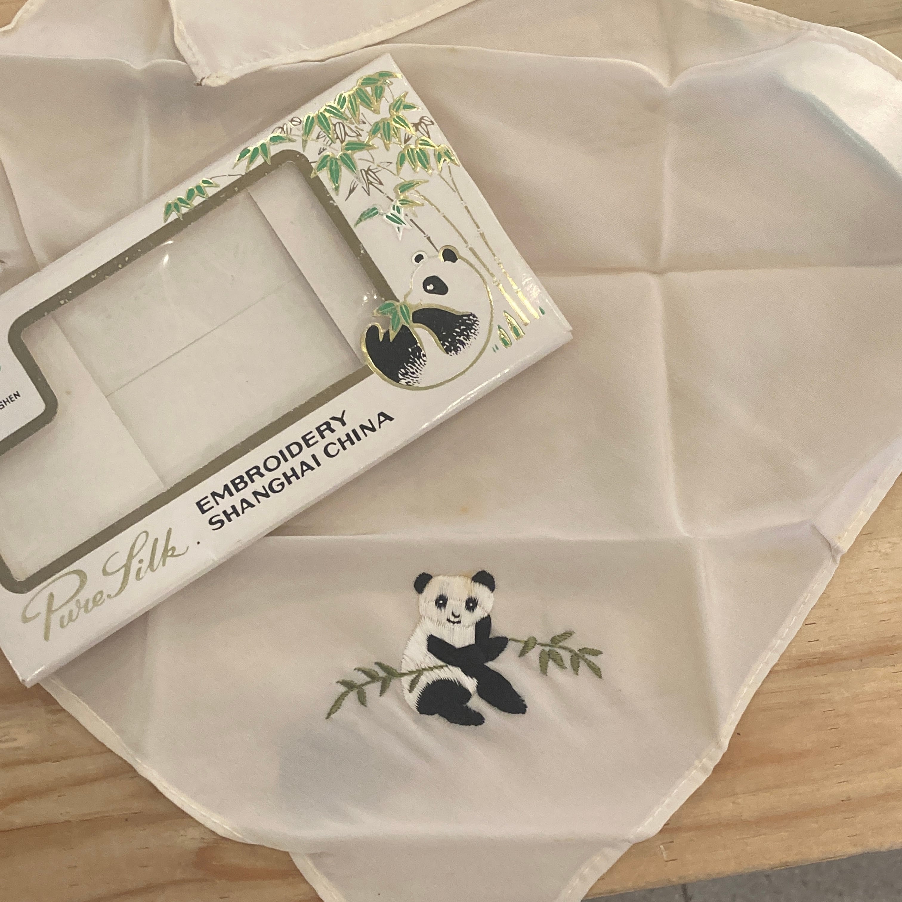 中国。シルクのパンダの刺繍ハンカチ。